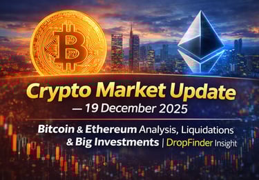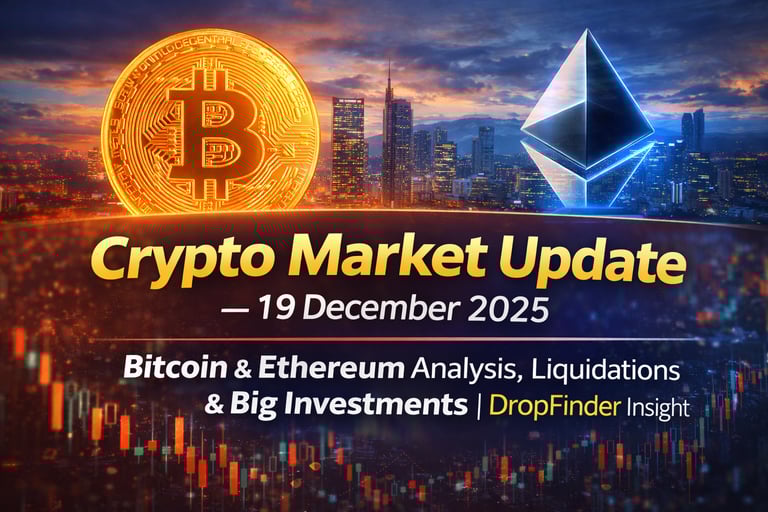 In-depth crypto market update for 19 December 2025 covering Bitcoin and Ethereum key price levels, top gainers and losers in the top 100, major liquidations, whale activity, and institutional investment trends with exclusive DropFinder insights.